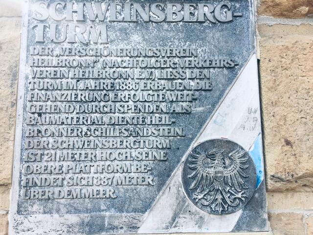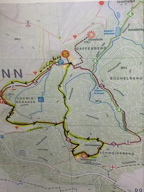 Ich parke auf dem Gaffenberg Parkplatz. Am Ende des Parkplatz gehe ich zwischen Wald und Weinbergen auf dem asphaltierten Wilhelm-Mattes-Weg. Schon nach wenigen Metern steht auf der linken oberen Waldseite eine Baummelbank – hier können Wanderer ihre müden Beine baummeln lassen – so werden müde Beine wieder munter. Weiter gehe ich auf diesem Weg. Ich komme am Wasserreservoir Schweinsberg vorbei – kurze Zeit später erreiche ich den Wald. Hier steht auf der Wegkreuzung die Skulptur „Jägerruhe“ - ein Förster mit Hund und Eule. Hier biege ich rechts ab auf den naturbelassenen Schanzenweg. Ich laufe durch den Wald, komme über eine Lichtung, dann wieder in den Wald. Kurz darauf endet der Schanzenweg und ich muss noch ein kleines Stückchen auf dem Membrodsweg laufen – dann geht es rechts ab auf den asphaltierten Schweinsbergweg. Es geht nun immer bergauf. Ein Hinweisschild zeigt mir den Weg zum Schweinbergturm. Ich biege am Hinweisschild links ab auf den Paulesweg. Es geht nun stramm bergauf und auf der rechten Seite sehe ich schon den Schweinsbergturm stehen. Auf einer Lichtung steht es groß und mächtig und lädt mich zum Aufstieg ein. Viele Stufen muss ich gehen um die schöne Aussicht zu sehen. Am Schweinsbergturm stehen Bänke, Tische und es gibt Grillmöglichkeiten. Hier mache ich eine kleine Pause und genieße mein mitgebrachte Vesperbrot und eine kühles Wasser. Dann geht es wieder auf den Paulesweg zurück und ich laufe auf ihm weiter. Es geht vorbei am Fernmeldeturm und am Forstwirtschaftlichen Betriebshof. Danach geht es links ab auf den „Steiler Weg“. Am Ende des Steiler Weg biege ich rechts ab auf den Schweinsbergweg. Nun geht es nur noch bergab bis zum Gaffenberg Parkplatz.