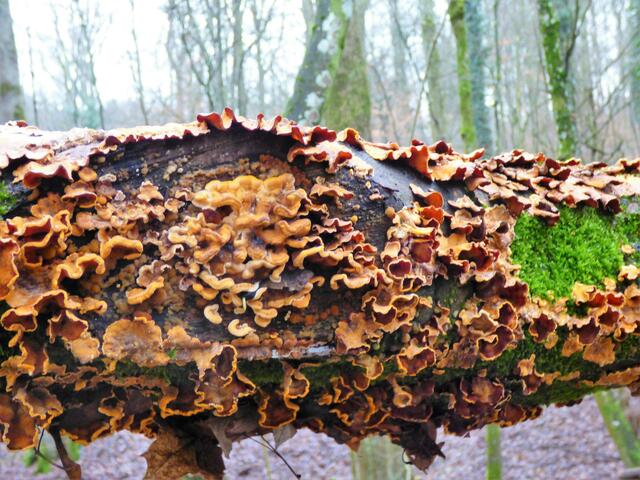 Unterwegs sahen wir noch wunderschöne Waldbilder, getrocknete Gräser, mit rotbraunem Herbstlaub behangene Büsche, filigrane Blüten und zu guter Letzt einen liegenden Baumstamm, der über und über mit gelben Pilzen besiedelt war. Faszinierend und eindrucksvoll.