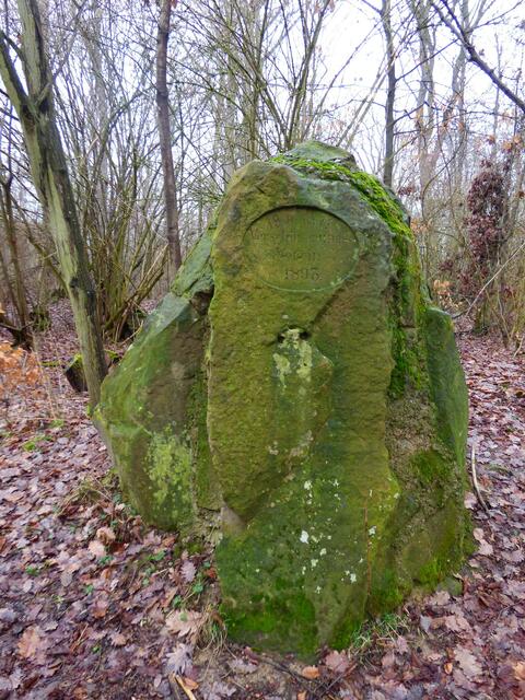 Die kleine Tour startete am Gaffenberg und schon wenige Minuten später stießen wir auf zwei imposante moosüberzogene Gedenksteine links und rechts des Wegesrandes. Auf dem linken Stein war eine Prägung zu sehen, die an den "Türkenlouis" Markgraf Ludwig erinnerte. Der rechte war dem Verschönerungsverein 1893 gewidmet. Ein erinnerungsträchtiges Ensemble bei den sogenannten Ludwigsschanzen, einstmaligen Artilleriestellungen, die Markgraf Ludwig Wilhelm von Baden-Baden damals zum besseren Schutz der Reichsstadt Heilbronn anlegen ließ. Die beiden Steine wirken fast wie ein Tor zum Wald - sehr einladend.