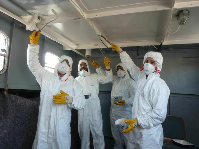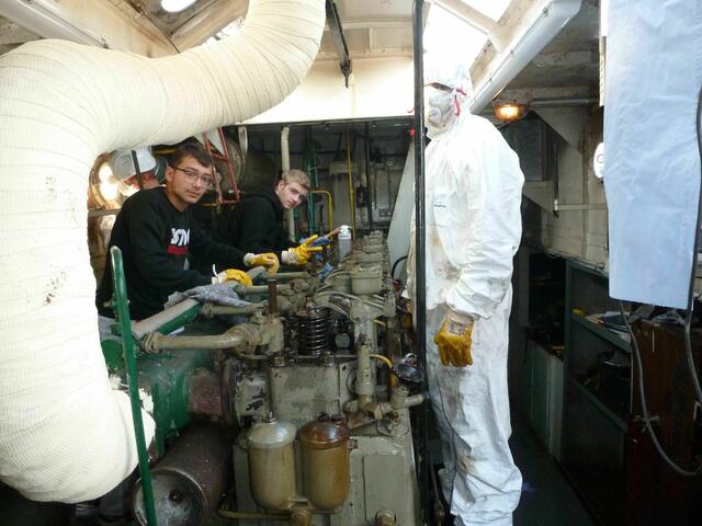 Zwei Wochen lang hatten die Schüler Ende letzten Jahres den Maschinenraum mit Bürste, Spachtel, Schmirgelpapier und Lösungsmittel auf Vordermann gebracht. Ziel sei es gewesen, die Maschinenteile wieder beweglich zu machen. Keine leichte Aufgabe, denn der 75 Jahre alte Schiffsmotor sei völlig verharzt gewesen, erläutert Fachlehrer Friedbert Klotz, der das Projekt betreut hat. Nach einer ersten Besichtigung des Hafenschleppers hatten die Schüler alle Arbeitsschritte selbst geplant und dann umgesetzt.