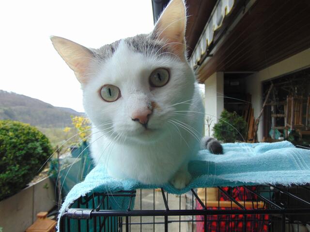 - Milly auf der Terrasse oben auf dem Käfig und unten drunter im Käfig der Philipp