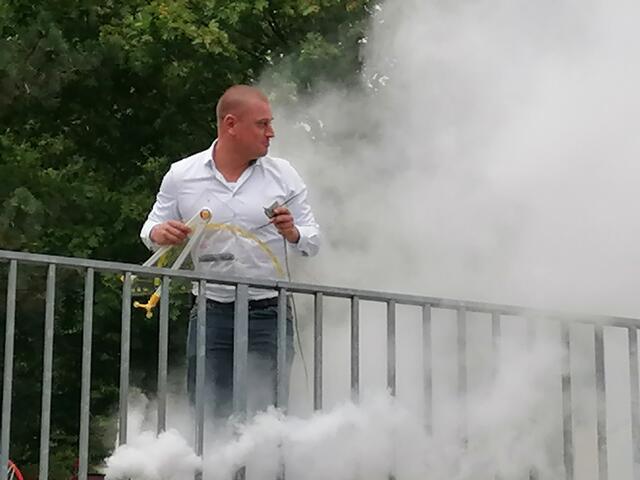 Plötzlich qualmte es im Schulhof und man hörte schon die Feuerwehrsirene! „Hurra die Schule brennt“ … eine Schauübung der Jugendfeuerwehr wurde spektakulär in Szene gesetzt, der Schulleiter Johannes Dirnberger wurde „gerettet“.