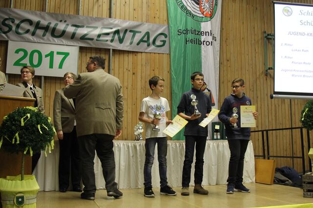Neckarsulmer Hoheiten beim Kreisschützentag 2017 Am 17. Februar 2017 wurde in der Mehrzweckhalle in Schwaigern-Stetten der Kreisschützentag 2017 gefeiert. Die Schützengilde Neckarsulm war mit einer Delegation von 21 Schützen und Angehörigen vertreten und bot somit für die geehrten und ausgezeichneten Schützen einen würdigen Rahmen. Nach dem Eröffnungssalut der Böllergruppe SSV Stetten a.H. und dem Fahneneinmarsch der verschiedenen Schützenvereine, begrüßte Kreisoberschützenmeister, Klaus Koch, die anwesenden Schützen und Gäste. Im Anschluss wurden die Ehrungen vorgenommen. Folgende Schützen der Schützengilde Neckarsulm wurden geehrt und ausgezeichnet: Königschießen des Schützenkreises Marvin Breuninger –Jugend-Kreisschützenkönig, Luftpistole 2017 Tabea Breuninger –Jugend-Kreisschützenkönigin, Luftgewehr 2017 Marlon Schwab -1.Ritter, Jugend Luftgewehr 2017 Simone Breuninger -1. Prinzessin, Luftgewehr 2017 Für verdienstvolle Funktionärsarbeit im Verein: Steffen Will- Kreisehrenzeichen mit kleinem Silberrand für 8 Jahre Für wertvolle Mitarbeit im Verein: Erwin Koydl-Verdienstehrenzeichen in Silber