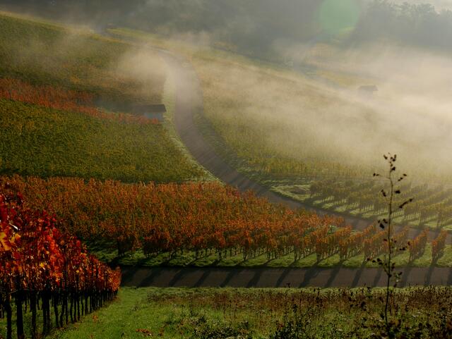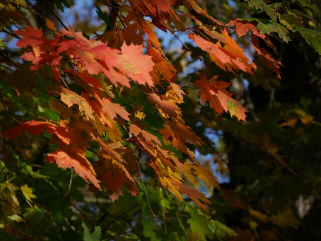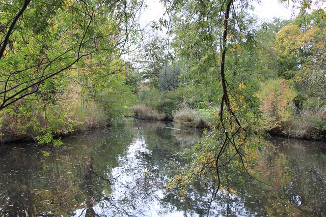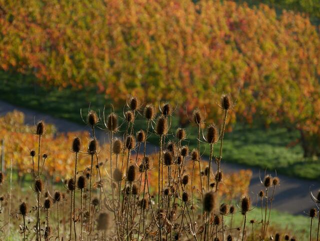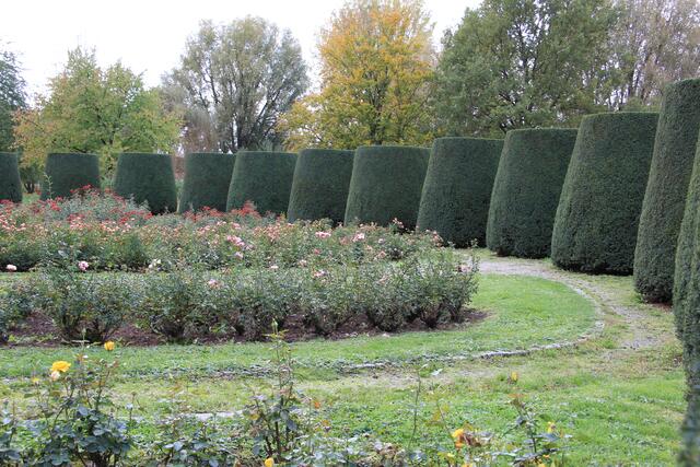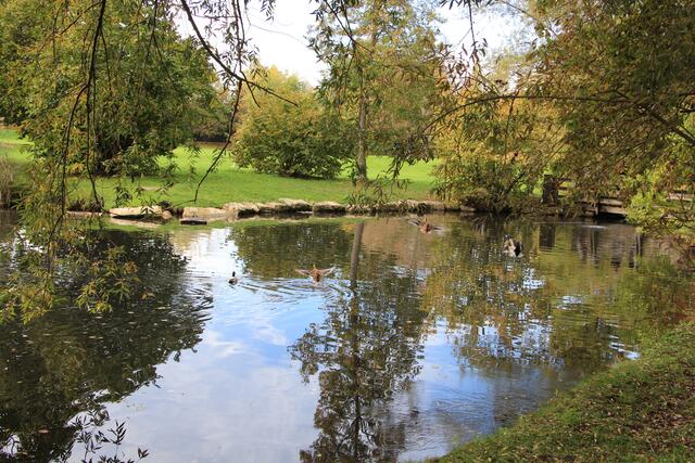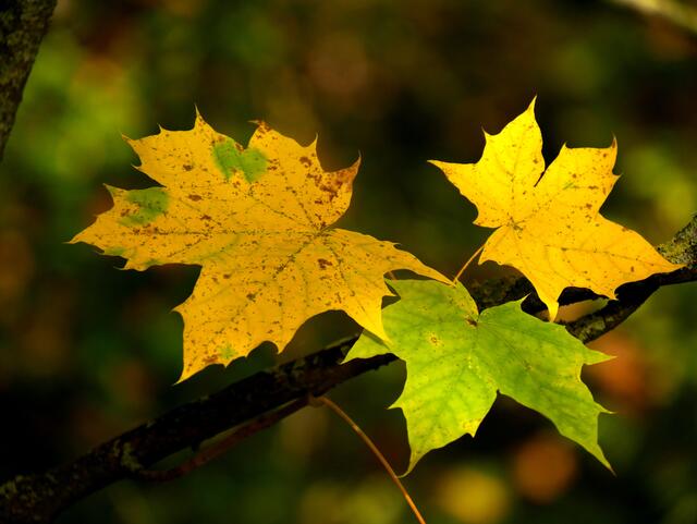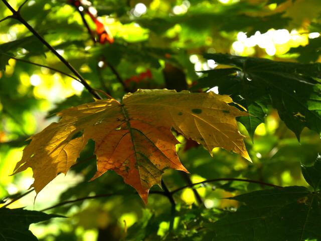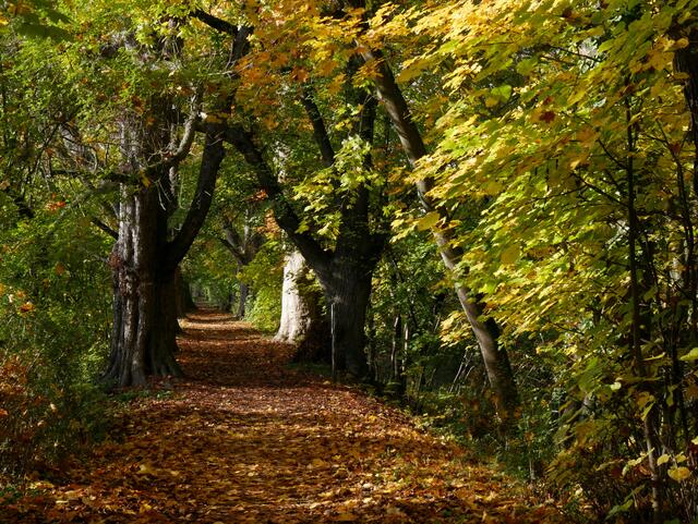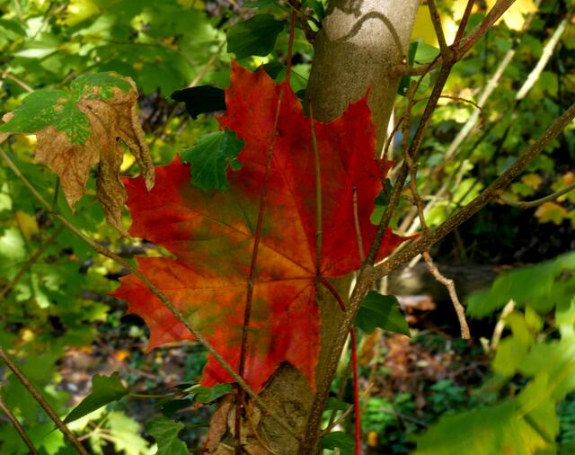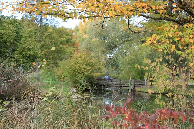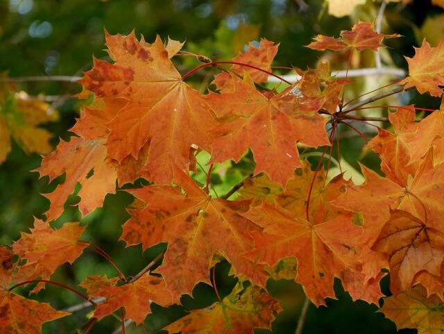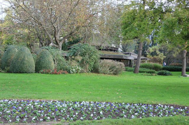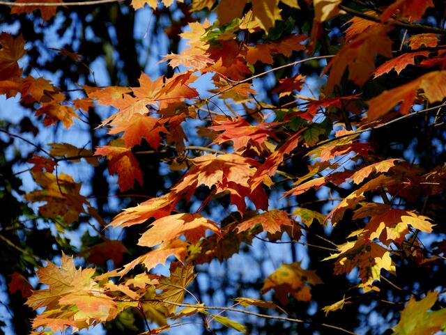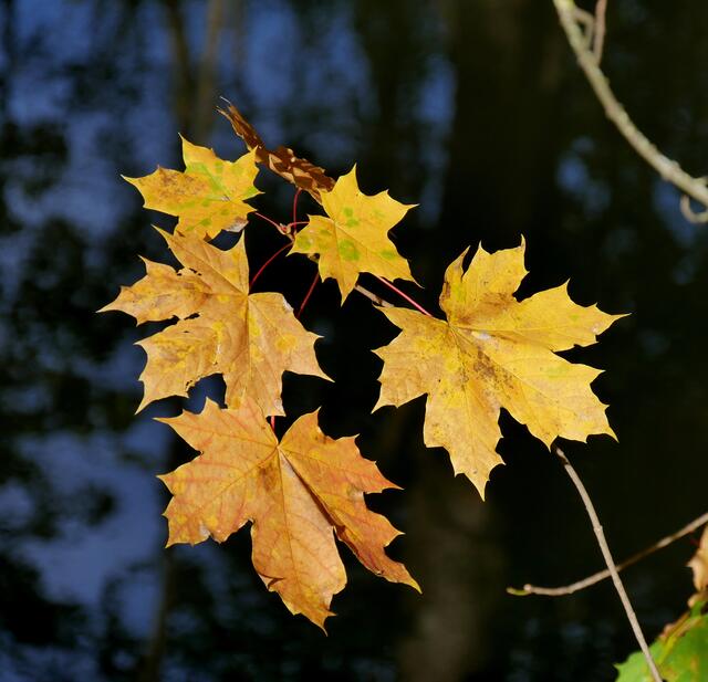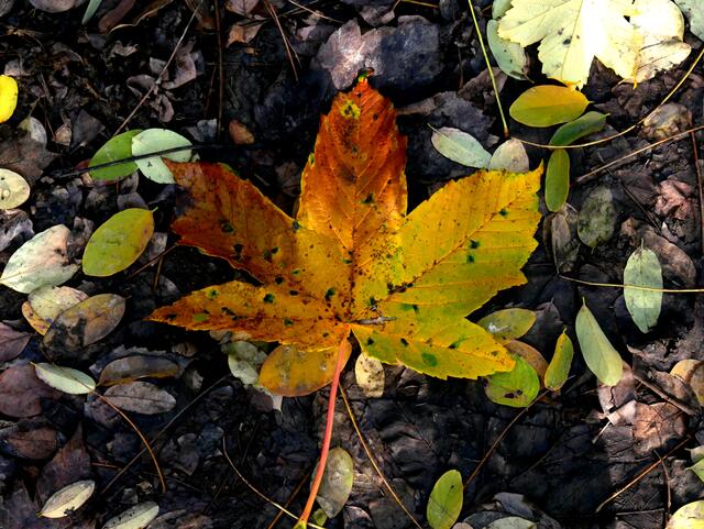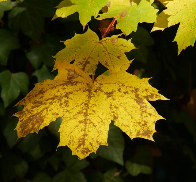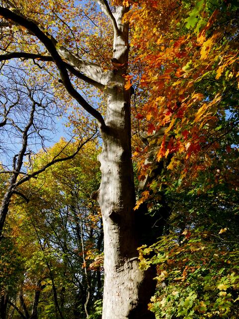 Das meiste Laub liegt am Boden und ergibt noch schöne herbstliche Bilder. Der Amberbaum hat sein Herbstkleid in diesem November nahezu abgeworfen. Unterm Amberbaum fühlen sich die Christrosen wohl, wie die Heleborus-Blätter zeigen.